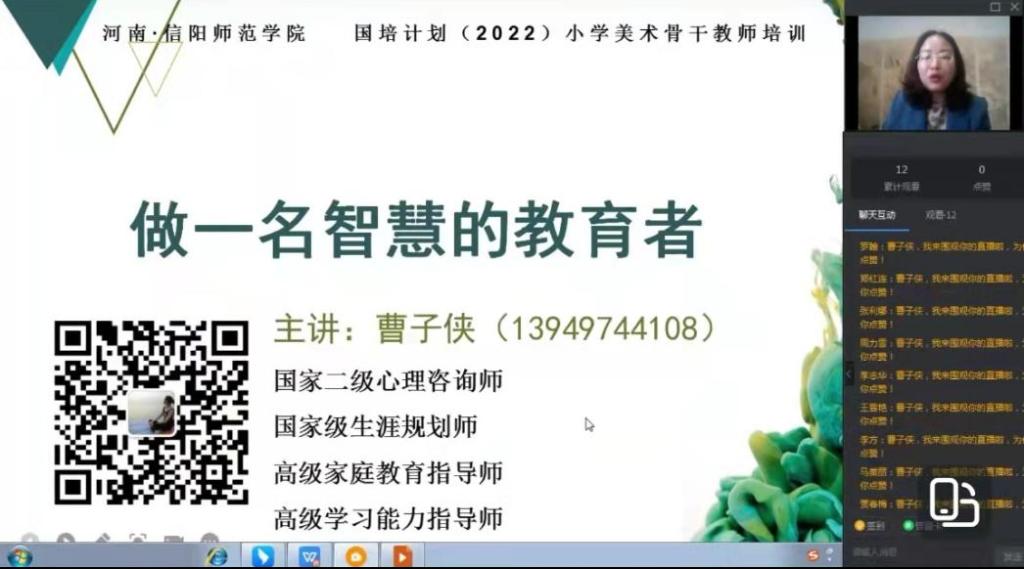 5月28日上午,应best365英国体育在线邀请,国家二级心理咨询师,青少年职业发展辅导师、曹子侠老师在线为国培学员做了题为“做一名智慧的教育者”的专题授课,2021年“国培计划”美术骨干教师培训班全体学员共同聆听了本次讲学。