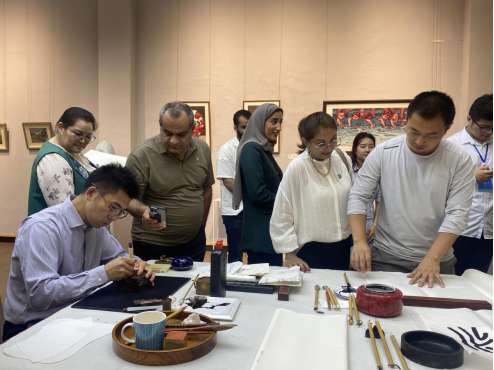 邹东升经理向国际友人们介绍了中国画艺术的传统和造型特点,分享了临制的任伯年《群仙祝寿图》等中国画作品的艺术魅力。公司老师通过现场挥毫泼墨的方式为外国友人展示了中国传统中国画、书法、篆刻艺术的创作方法,指导国际友人学习用笔、用墨、握笔、刻字等技巧,为国际友人题写了中文名字等,鼓励国际友人尝试动手书写、作画,并将作品赠送给他们作为纪念,展示中国的艺术文化。