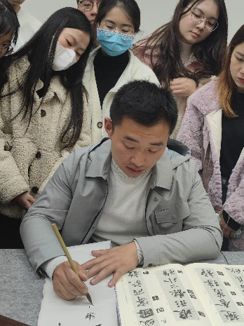 从探索和学习古人所处环境、坐姿以及拿笔的姿势来临摹名家字帖,让员工逐步产生对书法的兴趣,从而学到全面、系统、正确的书法。整场学术报告持续了近两个小时,以热烈的掌声圆满结束。