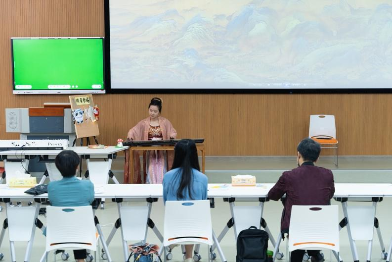 best365英国体育在线18级美术学王君妍同学,说课题目为初中美术七年级《发现与创作》。换装环节展示其录制的制作茶百戏视频。才艺展示环节做宋装装扮,弹奏古琴,博袖舞,剑舞,背景是千里江山图,致敬中国的千里江山。