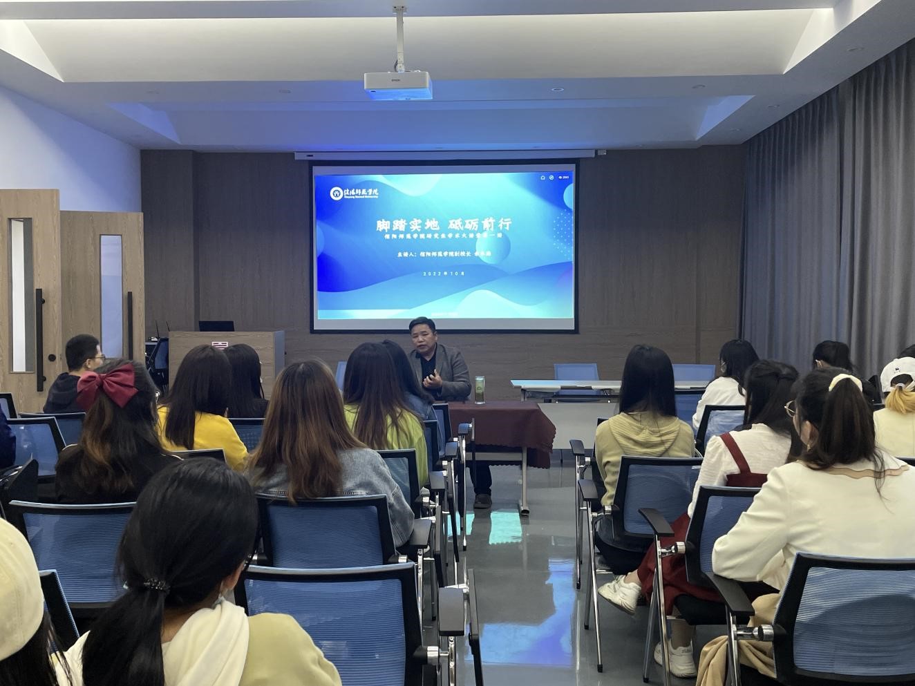 2022年10月15日下午三点,best365英国体育在线全体研究生在公司实训楼二楼艺研堂观看由信阳师范公司副董事长余本海先生主持召开的“研究生学术大讲堂第一讲——脚踏实地砥砺前行”线上直播讲座活动。