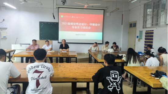 为做好2021级环境设计专业、视觉传达设计专业秋季专业实习工作,公司于7月3日在艺术楼308教室召开2021级环境设计专业与视觉传达设计专业的秋季专业实习动员大会。副经理张江波、党委副书记周刚、环境设计专业教研室主任甘露、视觉传达设计专业教研室主任刘焱、教学秘书明政、辅导员郑波及2021级全体设计专业员工共同参加会议,会议由郑波主持,线上线下同时进行。