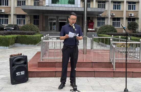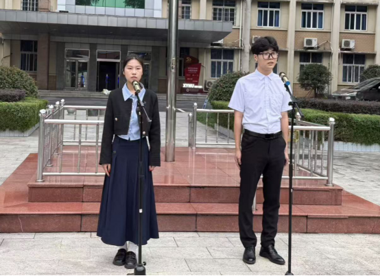 升旗礼毕,员嘉琪、冯浩哲同学登上发言台,深情讲述革命烈士毛国兴的英勇事迹。“红旗不倒,大别山区起浪潮,革命信念记得牢……”随着故事的展开,同学们仿佛穿越时空,见证了先辈为民族复兴舍生忘死的壮举。