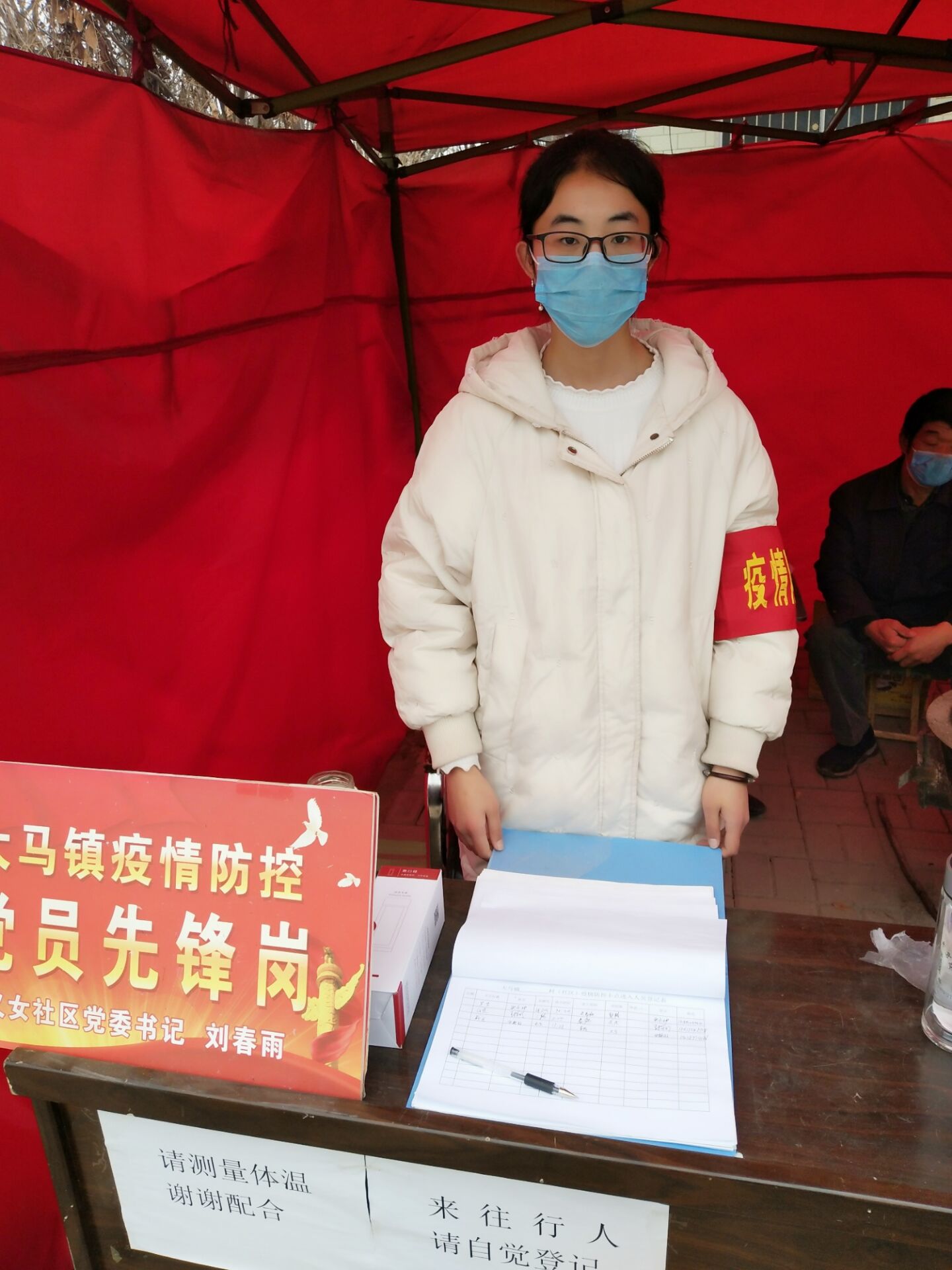 1月28日河南省开封市禹王台区南郊乡孟坟社区开展疫情防控工作时,她义不容辞报名参加,成为第一批投入疫情工作的人员,她服从党组织的领导和安排,在进行自我保护的同时全身心的投入社区防控疫情的各项工作中。每天早上7点准时到达帐篷中,对进出人员进行体温测量消毒和统计工作,将每日的疫情工作进展进行统计整理,为住户科普新型冠状病毒防疫知识,协助社区居委会人员对350余人进行上门逐一排查、登记工作,巡查禁止区民聚群。每天看到疫情的增长数据,内心有过恐慌,但是面对严峻的形势,她克服了内心的恐惧,与社区人员共同参与到防控工作中,每天虽然辛苦但是很充实,她表示要用自己的实际行动为社会贡献一份力量。