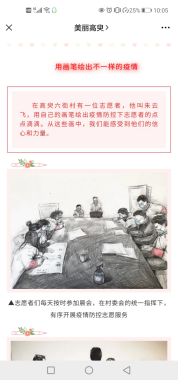 2019级美术的朱云飞绘制的防疫作品更是被政府官微拿来宣传,董梦丹、赵珏涵、王远航、李惠婷、陈晗、梁含、彭桐等也是利用自己的专长,给当地社区、公司村庄办板报、写标语、写对联、拍公益视频等,用不一样的方式为“抗疫”做出的贡献。还有大批学子主动请缨,成为家乡疫情防控的“战斗员”、“宣传员”、“保障员”......他们奔波在村头、社区大街小巷,担起卡点值班、巡逻宣传、信息登记、消毒排查等任务,正是这些青年人用青春坚守初心,用拼搏浇筑硕果,让青春在党和人民最需要的地方绽放绚丽之花。