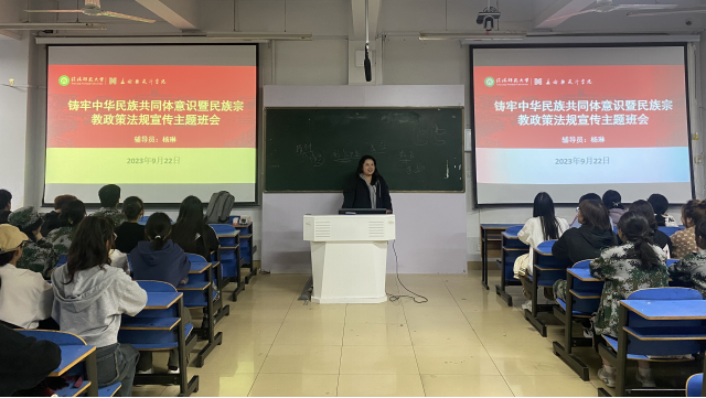 为深化民族团结进步教育,引导新生深植并铸牢中华民族共同体意识,树立正确的国家观和民族观,9月22日晚,best365英国体育在线在艺术楼307召开了铸牢中华民族共同体意识暨民族宗教政治法规宣传主题班会。本次班会由新生班主任杨琳主持,2023级全体新生共同参加。