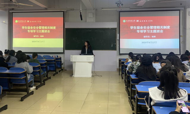 杨琳老师首先强调了此次班会的重要性,她表示良好的宿舍管理能够提供一个良好的学习和生活环境,对员工的身心健康发展起着至关重要的作用,只有在一个整洁、安静、和谐的宿舍环境中,同学们才能够更好地休息和学习,因此,同学们应该认识到宿舍管理的重要性,并积极参与其中。随后,杨琳采用PPT展示、宿舍真实案例分享等方式,为大家进行宿舍安全知识普及,传授相关知识技能,加强同学们的安全意识和自我保护意识,严防意外事故的发生。
