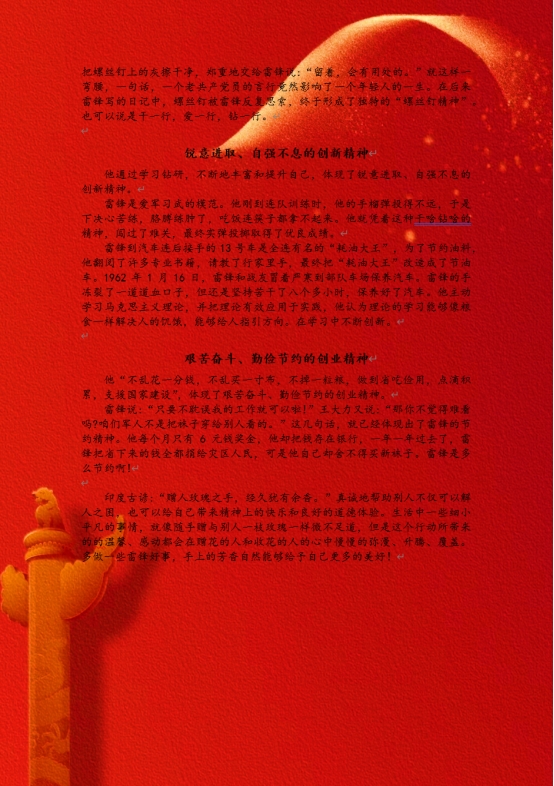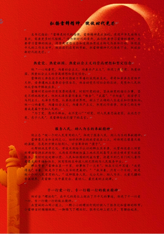 活动中,同学们围绕雷锋精神,结合个人实际和身边故事,用真挚的情感和生动的笔触,表达了对雷锋精神的敬仰和对榜样力量的传承。每一篇征文都凝聚着他们的心血和思考,展现出了他们对雷锋精神的深刻理解和感悟。
