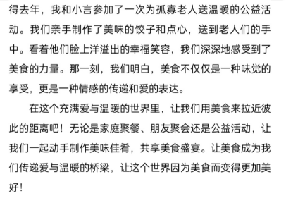 此次“共享美食盛宴,传递爱与温暖”线上征文活动的成功举办,不仅为公司校园文化生活增添了一抹亮丽的色彩,也成为众多参与者心中一段难忘的创意之旅。同时,活动也有效提高了同学们的文化素养和写作能力,为公司组织纪检部门在发扬珍惜粮食和传统文化方面积累了宝贵的经验。