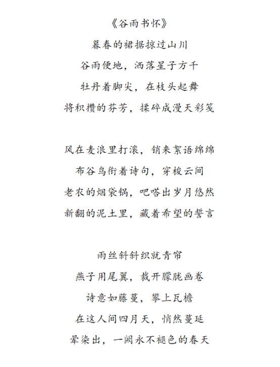 活动消息发布后,迅速在校园内引发热烈反响,同学们踊跃参与。大家充分发挥文学创作才能,以笔为媒、以诗传情,创作出一篇篇佳作。这些作品构思精巧、主题突出、意蕴隽永,字里行间尽显同学们对谷雨节气自然景象、人文内涵的深刻理解与独特感悟。经专业评审人员严格评审,最终评出一、二、三等奖若干名。