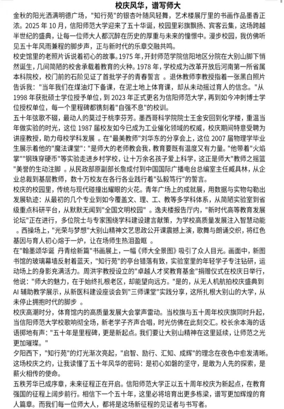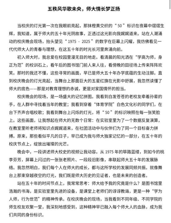 活动启动后获广泛关注,学子踊跃参与,以文字回溯师大岁月:或追忆恩师教诲细节,或讲述同窗并肩情谊,或描绘校园变迁风貌,或阐释“厚德 崇实 善学 敏行”校训的时代内涵,作品字里行间饱含对母校的眷恋与祝福,织就师大历史人文画卷。
