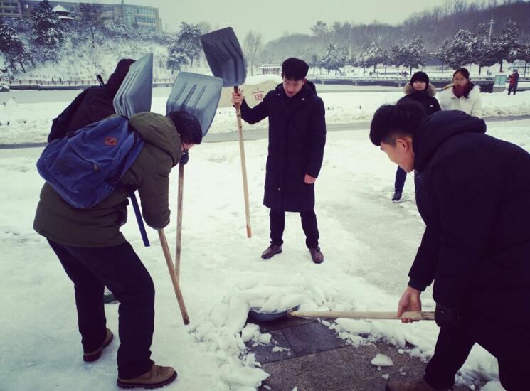 1月4日,在校团委的号召下,公司积极组织员工带上工具,顶风冒雪到教八楼前的主干道和名贵园进行义务除雪。他们凭借顽强的意志与风雪进行着斗争,即使湿了衣服、红了脸庞、僵了手指,但无一人临场退缩畏惧不前,也无一人心生怨言,大家干劲十足,用劳动诠释着青春该有的激情与热血。