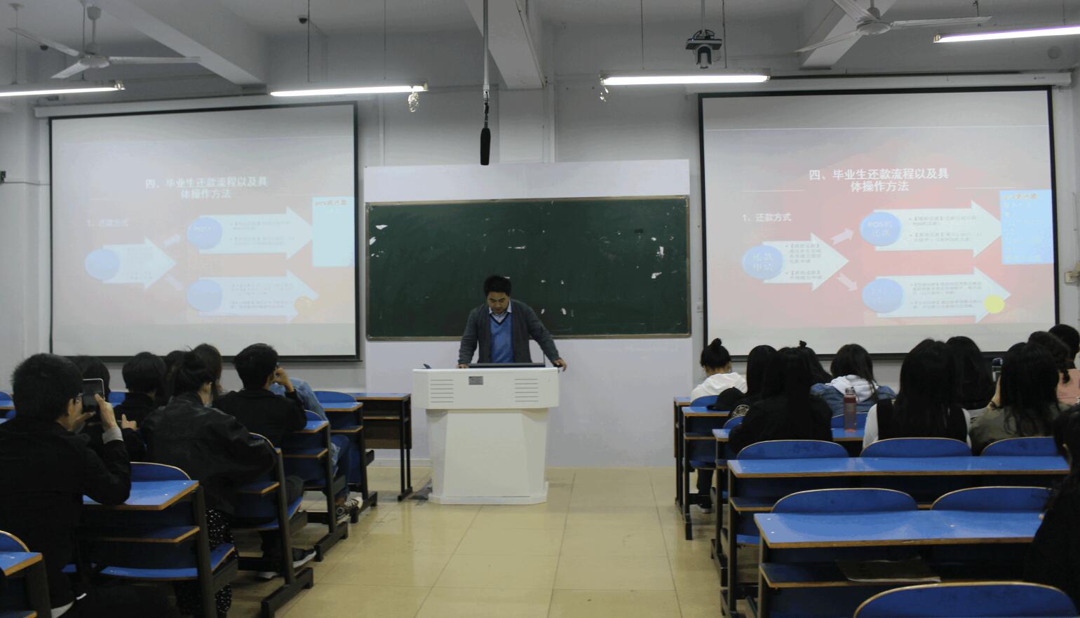 会上,郑波以PPT形式系统地向同学们介绍了公司现有的资助政策、资助项目申请流程、校园地贷款还款流程,并强调了按时还款的重要性。随后,重点讲述了关于毕业生诚信教育的问题,提醒同学们享受国家资助后要按时还贷、提前还贷。同时,希望同学们走出校园后要积极宣讲国家资助政策。