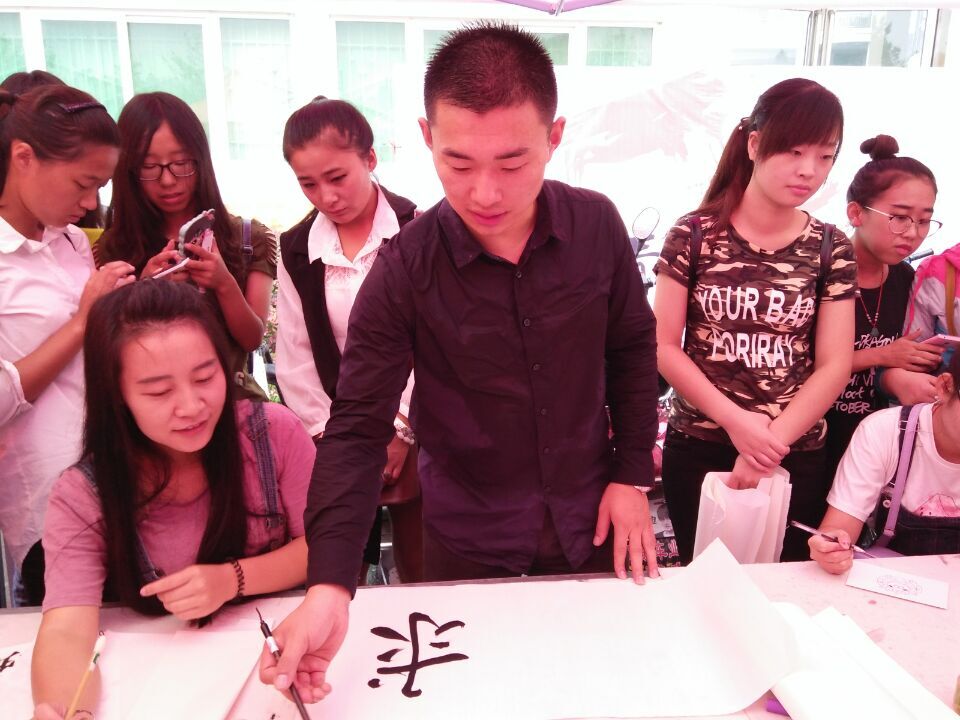 虽然天气阴雨连绵,但依旧不能阻挡同学们观看的兴致。过往的同学们不禁驻足欣赏,而且从展厅中观摩过画展的观众均可领取精美的明信片一张或书法一幅。书法作品分为楷书、隶书、行书等不同风格,明信片也有人物、风景、创作等多样元素,供同学们挑选。美术学班的同学们积极投入到现场活动中去,或画明信片、或写书法,现场气氛如火如荼。观看的同学们也可指定书写内容,私人订制一幅独一无二的书法作品。创造者尽情的挥洒着手中的笔墨,书写出一幅幅优秀的作品。张峰老师也在现场进行指导、书写,笔尖下的字浑然天成,引得在场的同学们一致叫好。临近中午,美术学班的同学们依旧坚守在那里赠送字画,只希望更多的人能看到我们的努力。