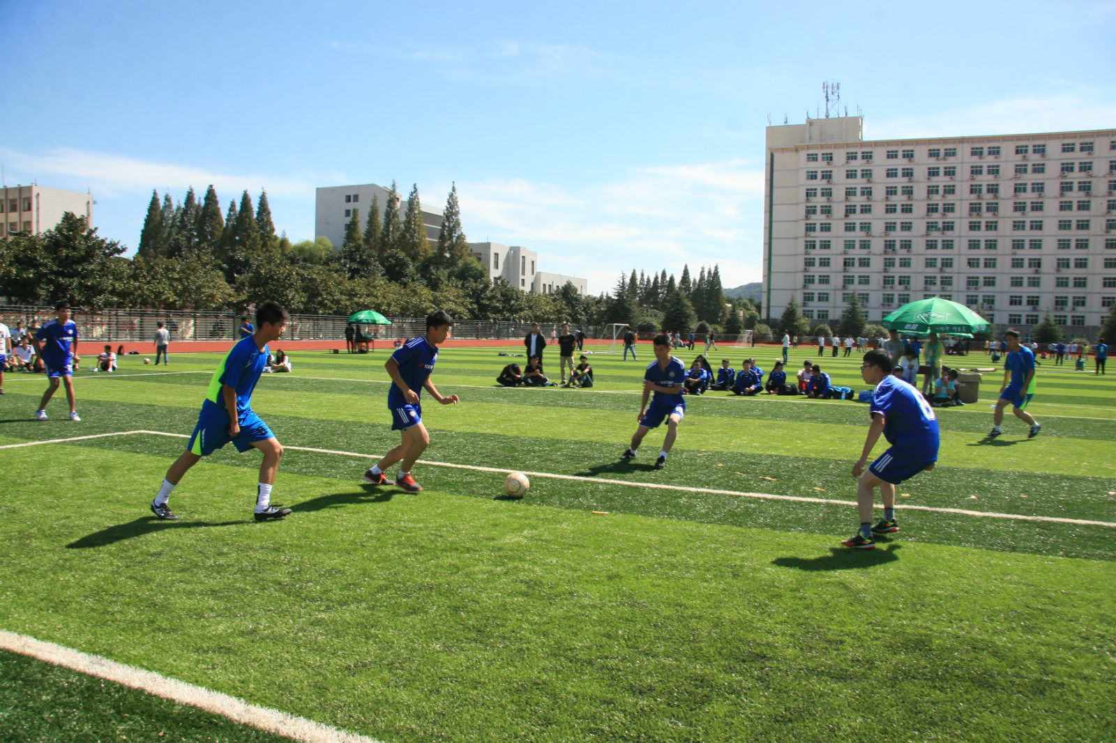 万里晴空,阳光正好,公司与体育公司首场交锋。赛前各队队员积极做好充分的热身准备,讨论作战布局。比赛正式开始,双方队员迅速进入状态,随即展开激烈的角逐。公司队员配合默契,巧妙传球,展现了队员们精湛的球技。虽然体育公司的队员比公司队员的实战经验丰富,但公司队员坚持不懈,顽强拼搏,全力拦截。双方队员你追我赶,不相上下,赛场上充斥着紧张的氛围。扣人心弦的比赛让现场的观众目睹了场上队员的实力,感受到了足球的魅力。