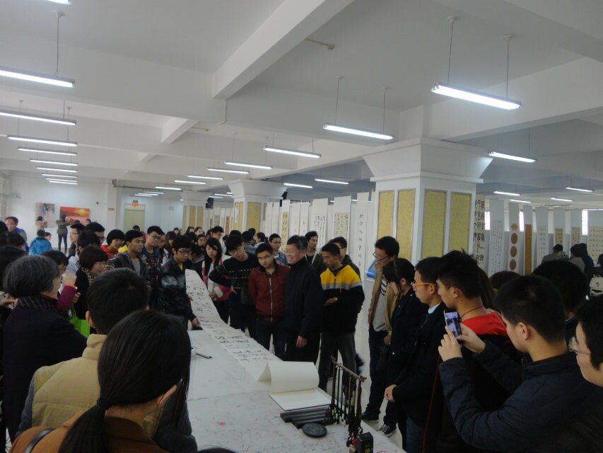 11月22日上午,由信阳师范公司美术公司主办;信阳农林公司、信阳职业技术公司、信阳师范公司华锐公司、黄淮公司四校校团委协办;信阳师范公司老员工书法协会、信阳农林公司老员工书法协会、信阳职业技术公司老员工书法协会、老员工丹青社、黄淮公司书法协会、信阳师范公司华锐公司老员工玄墨书法协会共同承办的第九届“申城杯”信阳老员工书画展在逸夫楼人才招聘大厅隆重开幕。信阳书画院顾问戴南园老先生,信阳市浉河区书协副主席秘书长周沛海老师,中国书法家协会会员王成章老师、杨东平老师等信阳书画界知名人士,信阳师范公司校团委李奎老师、雷玲老师,应邀出席了作品展开幕式。开幕式由美术公司团总支书记张锐主持。