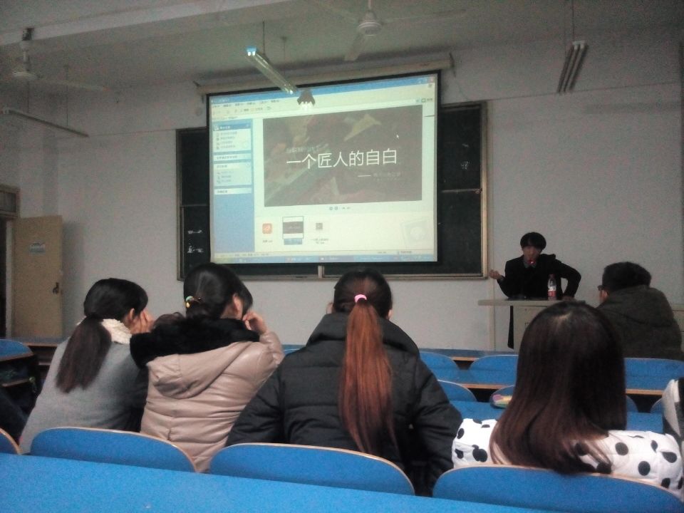 11月23日晚,美术公司特邀湖北美术公司毕业设计师陈哲于艺术楼307作了题为“互联网时代下一个匠人的自白”专题讲座。2014级设计专业全体同学共同聆听了此次报告会。