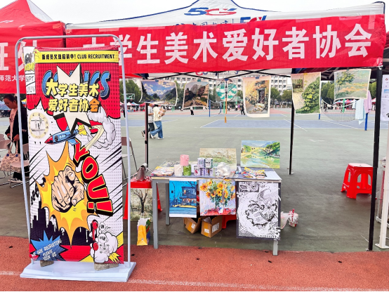 在美协会长、团支书与各部长的精心策划与布置下,美协的展位吸引了众多新生的目光。现场展示了油画、水粉画、手绘团扇等丰富多彩的作品,透露出浓厚的艺术气息。同时,海纳手绘等特色项目也抓住了新生的喜好,为他们提供了认识和了解美协的机会,激发了他们加入美协深入学习的兴趣。