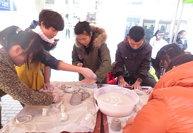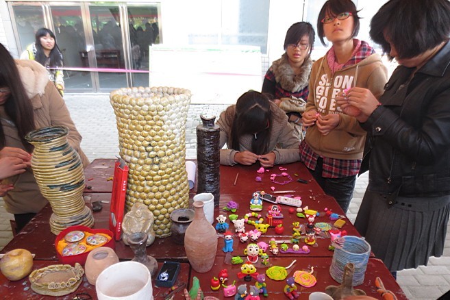 继陶艺知识讲座后,这次陶艺制作展就陶瓷的基本概念、制作过程、彩绘艺术给大家全面、细致的展示中国陶文化的魅力。活动现场分为制作区和展示区,在制作区,该协会成员认真地向大家讲解了关于陶艺制作的技术要领,以及软陶、高白泥和拉胚制作的方法和特点,其中,泥条盘筑法是陶艺成型技法中最方便,造型表现力最强的技法之一,可以制作出圆形、方形、异形及雕塑等多种造型。大家根据自己的喜好,积极参加制作,“没想到自己也能制作出这么精美的小陶人啊!”一位男同学赞叹道。在展示区,优秀的往届作品琳琅满目,卡通动漫形象、装饰品、生活用具等件件各具特色、形象生动。给初学者提供了一个参考学习的平台。现场气氛活跃,好评连连。