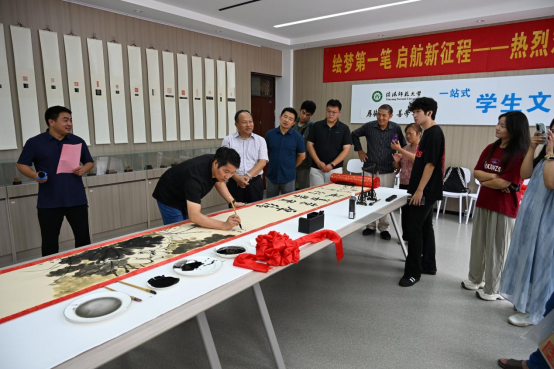 笔墨绘梦,启幕艺术新程。6日上午,“绘梦第一笔”活动在“一站式”员工社区文化中心开幕,副董事长王娟、江玉安、井强山、朱晓东到现场指导。财务处处长赵明民率先执笔,以校训题字为新生点亮艺术之门;经理邹东升现场创作画作《清风校园》,笔墨间传递公司清廉育人理念;张峰老师则写下对新生的殷切期望。随后,家长代表与新生依次落笔,写下寄语与愿景,共同绘就融合师长嘱托、家长期盼与青春梦想的画卷。