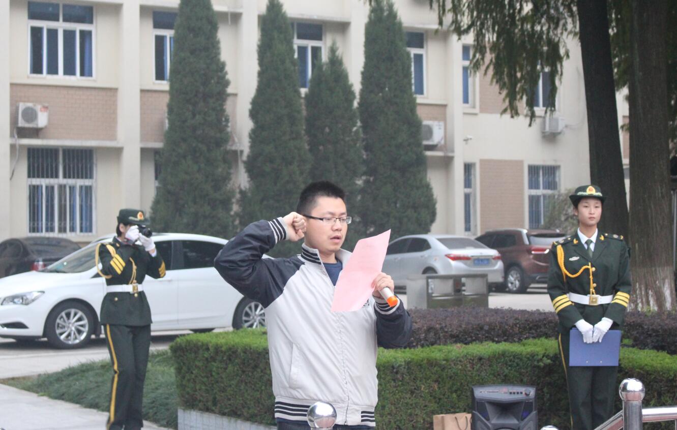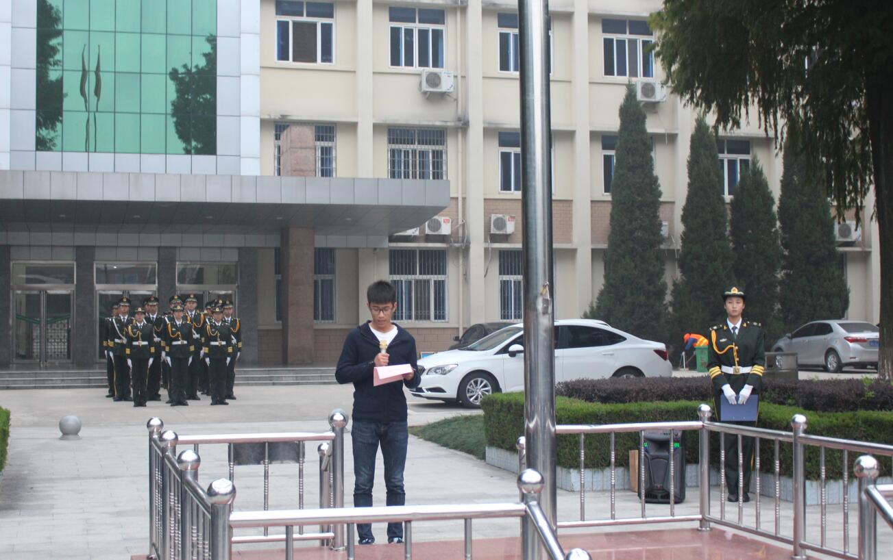 升旗仪式在庄严的国歌声中拉开帷幕。鲜艳的五星红旗在雄壮的国歌声中冉冉上升,全体师生肃立,行注目礼。杨轶中作国旗下讲话,他表示大学是一个新的开始,面对这稍纵即逝的时间,希望同学们可以珍惜时间、努力拼搏、证明自己、超越自己。并对学子们提出了“坚定信念,树立目标”、“培养习惯,孕育风气”、“学习要'深博'兼顾”,“共同进步,建立友谊”四点要求,寄语学子们要志存高远,奋发图强,胸怀祖国,心系人民,为实现中华民族的伟大复兴而做出无愧于时代与历史的贡献。随后新生代表史广升作国旗下演讲,他表示作为新一代年轻力量,我们要准确定位,牢牢把握大学四年的学习机会,争取以有限的时间学习无限的知识,为将来投身建设中国特色社会主义伟大事业奠定坚实的文化科学基础。最后,张锐带领全体团员重温了《共青团入团誓词》,激发了同学们对党、对祖国的热爱之情。