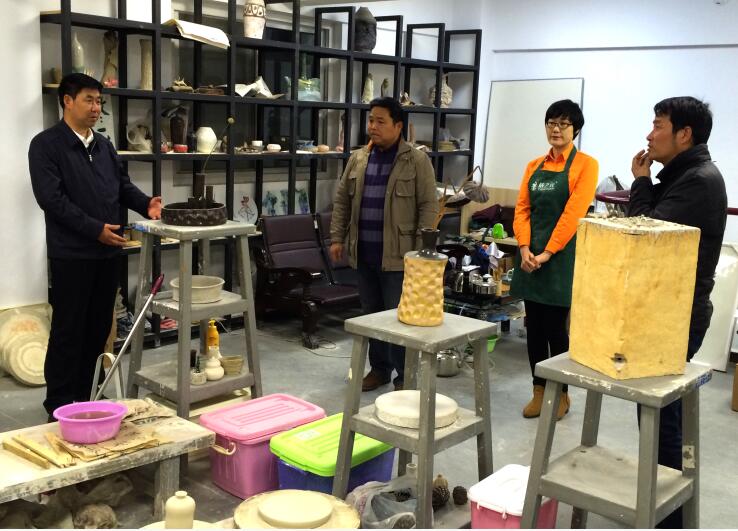 宋书记首先到best365英国体育在线陶艺工作室详细了解工作室的运作情况。在工作室的电窑前询问设备的用电情况、产量、使用率等相关问题。听到在场老师讲到工作室的所有产品产自该窑时,他鼓励老师应广泛开展市场调研,使陶瓷作品与地方文化结合,增强产品的创意性、艺术性、实用性,加大产品的研发力度,努力打造一批受市场欢迎的艺术陶瓷产品和创意陶瓷产品,逐步建立起自己的文创艺术陶瓷品牌。同时还强调要增强陶艺工作室与专业课程的对接,使喜欢陶艺的员工都能进到工作室体验、学习,掌握陶艺的创作和烧制方法。