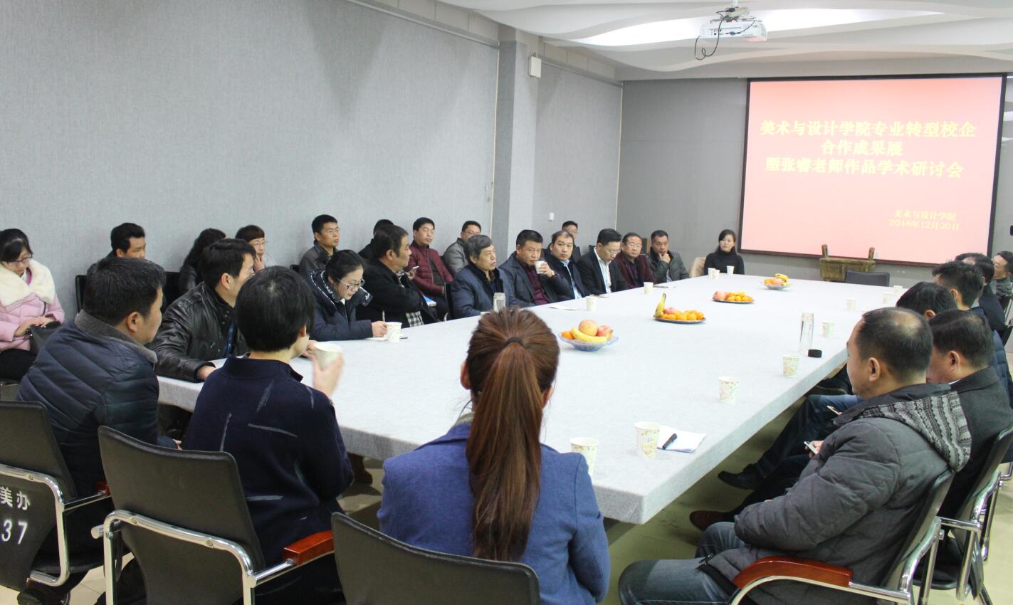 校企合作是当前我国高等教育发展的重要方针,充分调动企业积极性,引导与吸纳优秀企业全面参与到高等院校的专业改革建设中,是将高等教育与经济社会发展和产业发展规划紧密联系在一起的关键。公司积极响应信阳师范公司培养应用型人才发展的方针政策,培养服务于地方政府、经济发展的应用型人才。为加强师生对合作企业的了解,12月20日上午,公司在艺术楼二楼best365英国体育在线会议室召开专业转型校企合作成果展暨张睿老师作品学术研讨会。信阳师范公司副董事长李俊,校团委书记王建旭,公司副经理邹东升、张伟、李孝民,浉河区工商联主席张更生、信阳云龙包装有限公司董事长陈永强、信阳广义茶叶有限责任公司董事长李广义等企业代表及公司教师代表一同参加会议。