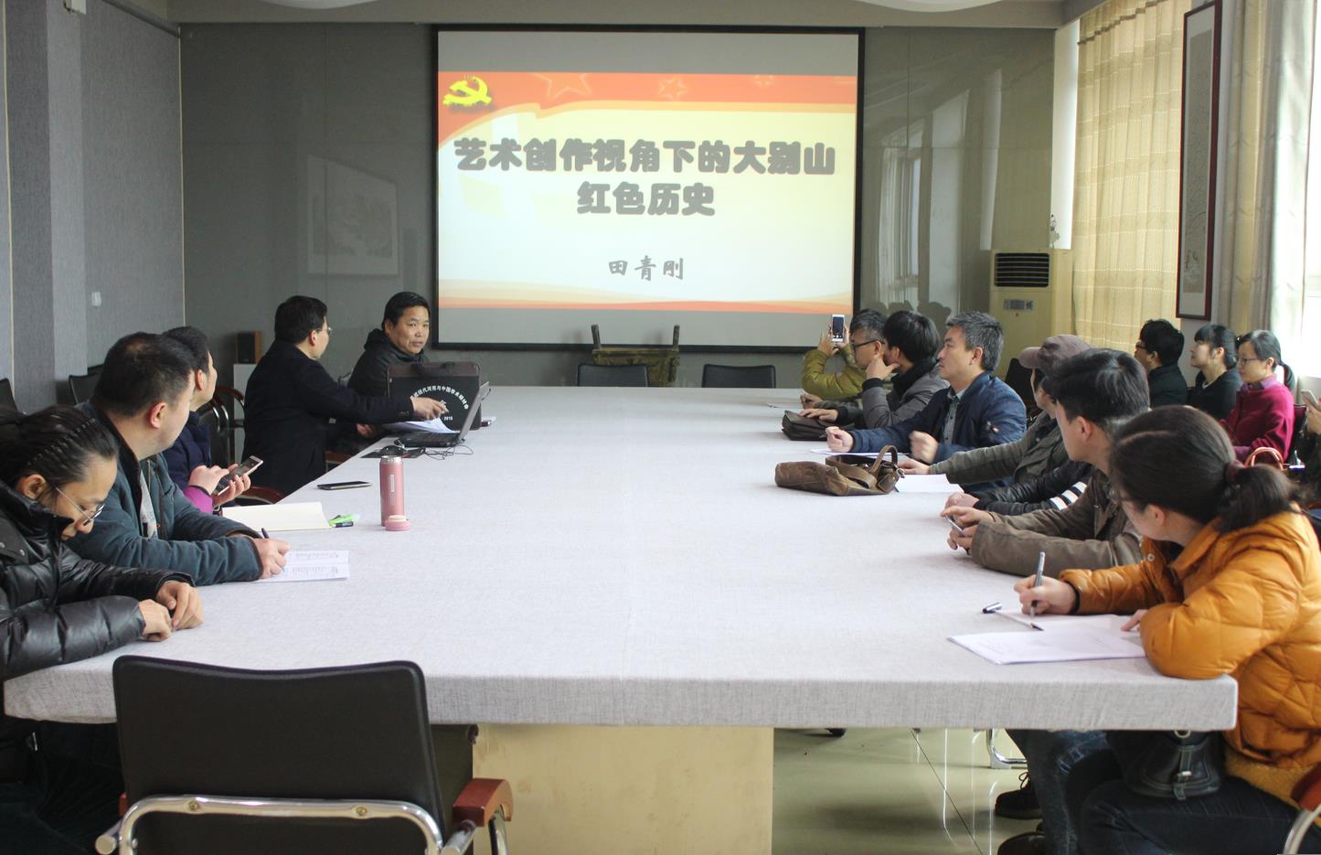 报告会围绕大别山红色历史概貌、大别山红色历史贡献与大别山精神、大别山红色历史创作题材与选题视角三部分展开。会议伊始,田青刚教授为在座教师简单介绍了大别山区域概貌,从"红色"的视角带领在座教师了解大别山。他讲到就大别山红色精神形成而言,三大武装起义及其成果促进了鄂豫皖革命根据地的建立与发展,大别山精神即中国共产党领导大别山革命斗争时期所形成的以"红旗不倒"为主要特点的革命精神。田青刚教授重点强调了基于大别山红色历史的美术创作题材与选题视角问题,可从宣传红色统一战线政策的题材等方面入手,积极创作出宣传大别山红色文化、反映社会经济文化事业发展的作品。最后,邹东升为此次报告会作出总结,希望公司教师多加思索,积极创作。