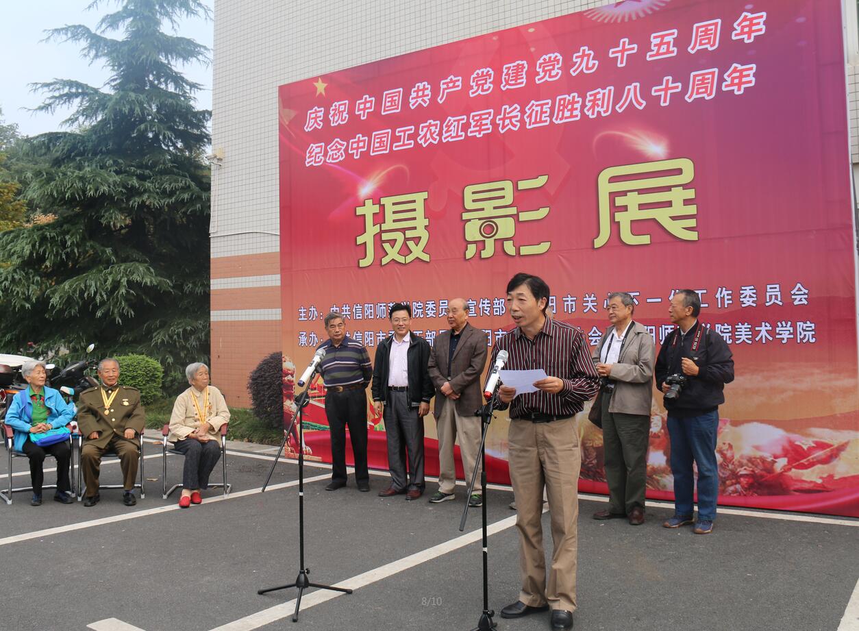 10月8日,由信阳师范公司党委宣传部和信阳市关工委共同主办,信阳市委老干部局、信阳市老年摄影家协会和美术公司承办的“庆祝建党九十五周年和纪念红军长征胜利八十周年”摄影作品展于公司艺术楼展厅举行。信阳市关工委主任王连基、中共信阳市委老干部局原局长邱家亮、市委宣传部调研员刘平、市老年摄影协会主席王定一、三位抗战老兵代表、信阳师范公司党委宣传部部长丁少峰及公司负责同志等出席了开幕式。开幕式由公司党委书记周子良主持。