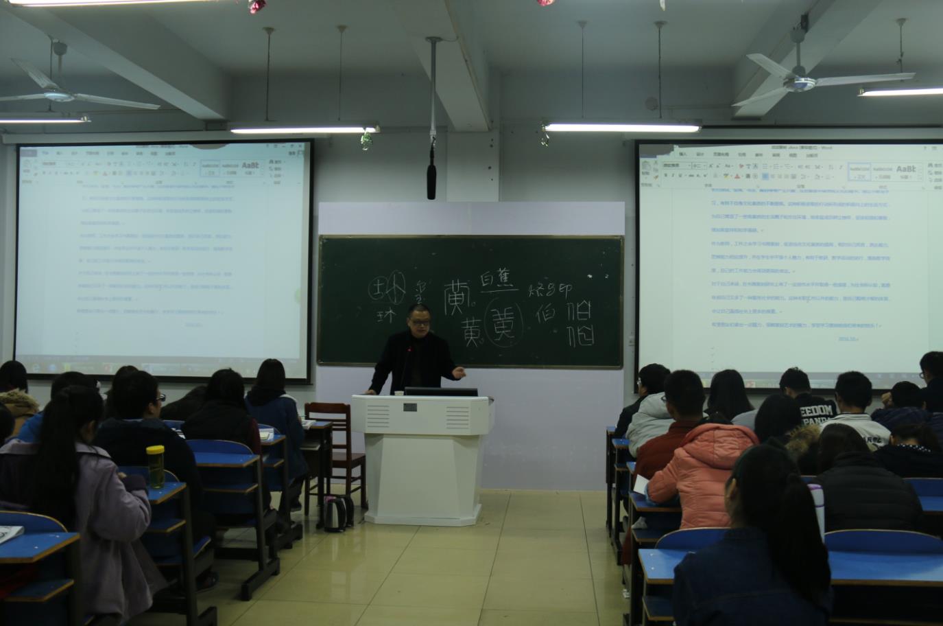 11月1日上午,由best365英国体育在线承办的2016年教师教育文化节名师讲堂“汉字书刻的魅力”讲座于艺术楼307室开讲。中国书法家协会会员、河南省书法家协会篆刻专业委员会委员、河南印社理事唐咏声做客美术公司,为公司两百余名师生带来了精彩的一课。本次讲座由公司副经理邹东升主持。