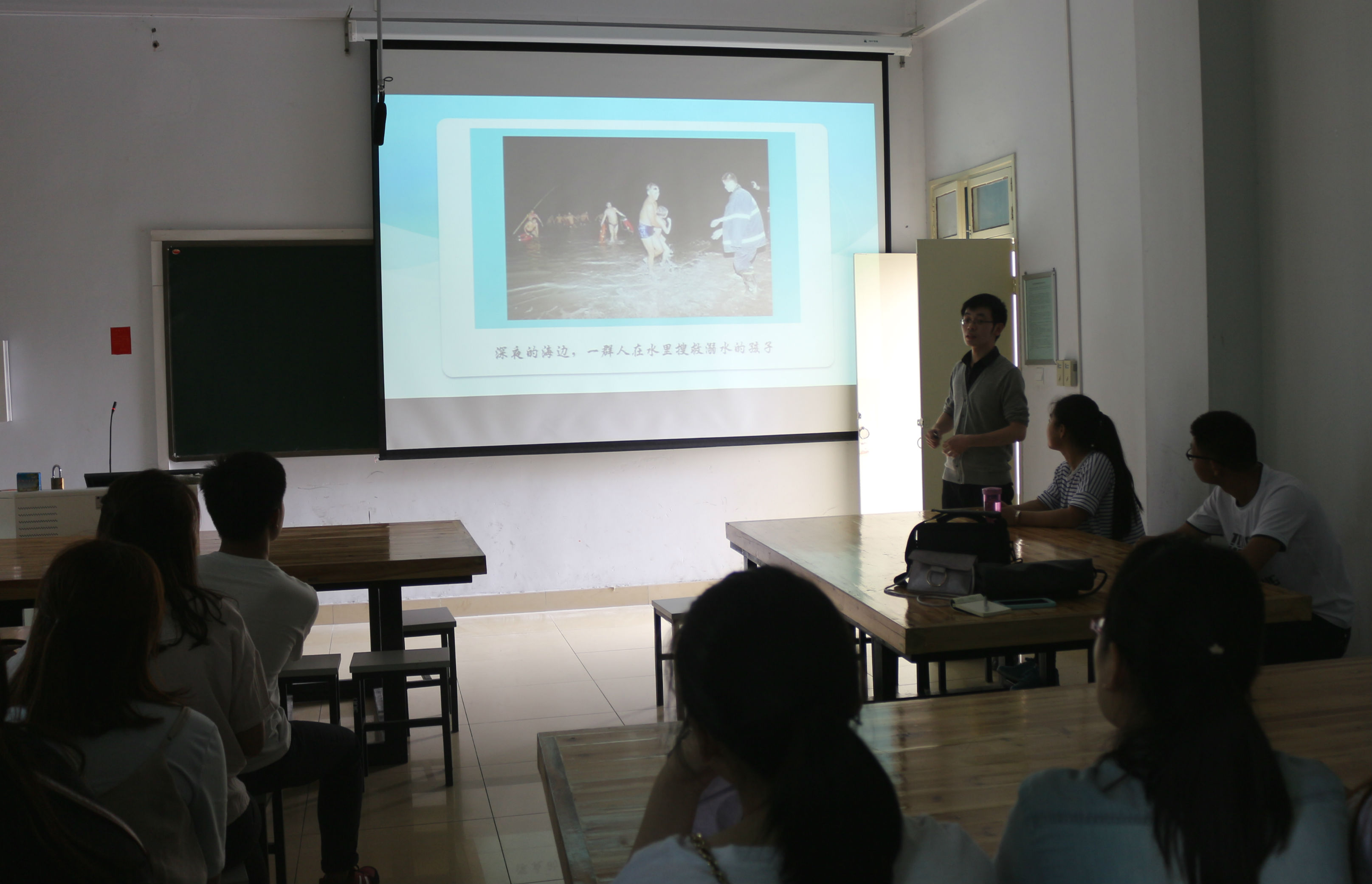 班会由主题导入、案例分析、理论传授和视频展示等四个部分构成。班会先以ppt形式展示了溺水的图片和数据,引起员工的警觉。随后,施远带领大家深入探讨溺水事故的典型案例。同学们仔细分析了案例中存在的问题,并对此进行激烈讨论。随后,施远就溺水后的自救、互救和急救等安全知识进行讲授,并通过视频展示“手拉手”救援的危险和心肺复苏术的做法。