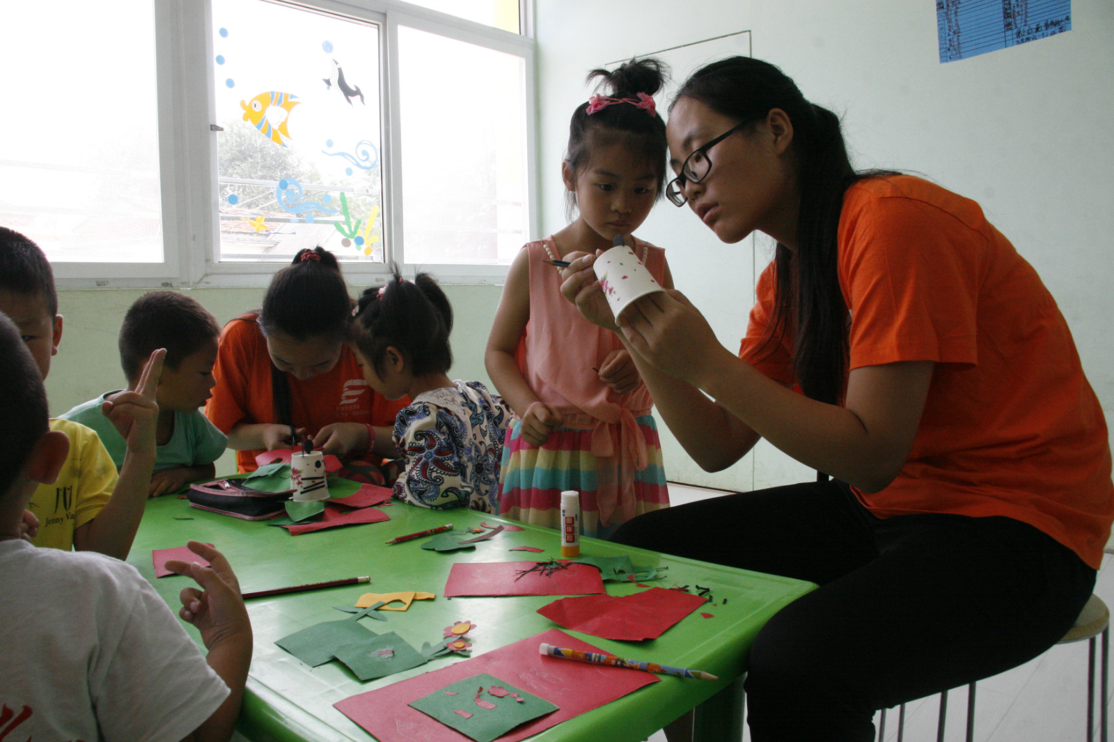 小朋友对大家的到来表现出极大的热情,纷纷举手让志愿者指导他们作画。志愿者结合本专业所学技能,教孩子们做手工铅笔装饰、幼儿群体生活教育作品画、组织墙绘活动等一系列特色活动。志愿者拿出先前准备好的海绵纸、胶棒、卡纸、笔等工具,为孩子们带来新颖的创作体验,充分的调动了他们的积极性。培养孩子们动手能力与团体协作精神,促进小朋友的健康成长。活动中,志愿者耐心教学、细心指导,与孩子们进行愉快的聊天、交流,不断的鼓励增强孩子们的自信心,发现闪光点,充分发掘他们的特长。孩子们乐此不疲的进行绘画创作,沉浸在那份美好之中。活动最后,志愿者为孩子们送上了学习用品和创作模型,希望他们能够努力学习,茁壮成长。虽然志愿者与孩子们相处的时间并不算长,但是建立起的感情却是深厚的。临走之前的依依离别、声声再见是最美的记忆。