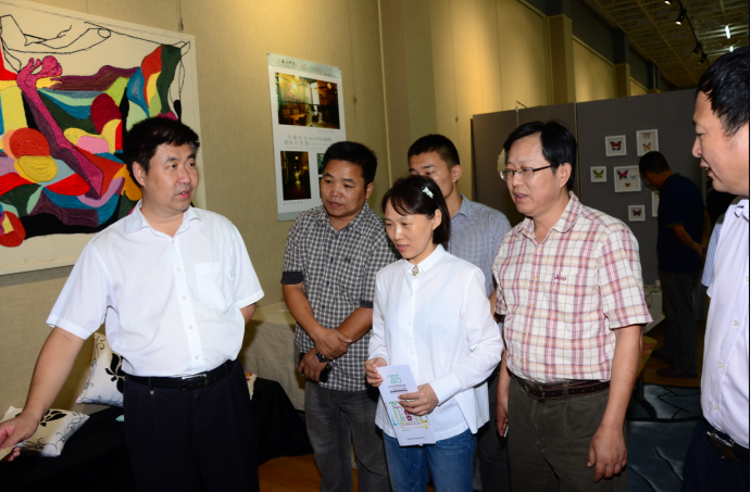 在艺术楼展厅,结合展出的专业转型成果,美术公司经理刘根货教授向专家组一行介绍美术公司专业转型的创新育人方式:一是强化实践育人,结合实际不断优化人才培养体系,根据专业特色修订应用型人才培养方案,完善应用型课程体系,构建“三课堂”联动的实践教学体系,完善老员工创新创业教育服务体系;二是深化校企合作,利用员工及专业教师创办的企业资源,大力加强实践教学平台和基地建设,整合提升实验教学平台,合作共建校内实训基地,加强校外实习实训基地建设;三是坚持引培并举,努力推动“双师型”教师队伍建设,美术公司设计专业全体专任教师全部考取相关职业资格;四是着力建设中原书画协同创新中心等,协同共建应用型科研平台,积极开展区域文化资源挖掘研究,大力促进研究成果转化。