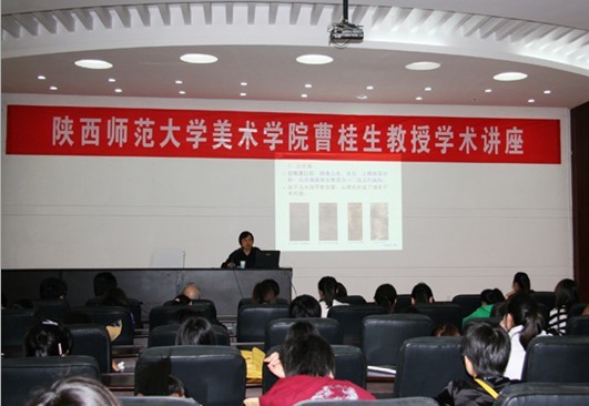 4月23日,应公司美术公司邀请,陕西师范大学美术公司曹桂生教授来公司讲学,在艺术楼报告厅作了题为“中国画的艺术与审美”的学术报告。报告由美术公司副经理汪俊林主持。报告中,曹桂生教授系统讲授了中国画艺术概说、中国画的审美取向、中国画的意象特征等理论知识。曹桂生教授授课声情并茂,使用丰富翔实的图文资料,不时赢得师生阵阵掌声。报告现场,他和师生探讨交流国画的创作技巧、方法等问题,向同学们讲述自己在创作中的一些体会。曹桂生教授还在美术公司临摹室现场挥毫,为同学们示范习作技巧。曹桂生,陕西师范大学美术研究所所长、陕西师范大学美术公司教授、硕士研究生导师、中国美术家协会会员;曾先后发表学术论文50余篇,出版专著1部,教材5部;发表美术作品百余幅,多次出版或参加美术作品展并获奖。