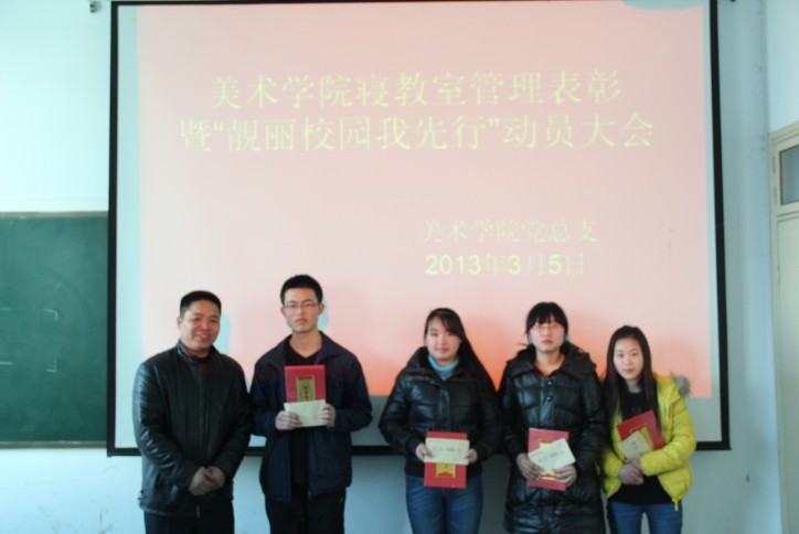 大会在热烈的掌声中开幕。美术公司党总支副书记李孝民首先宣读“信阳师范公司寝教室管理工作先进集体及个人”名单,公司党总支书记周子良依次为2012年寝教室管理先进班集体、寝教室管理文明教室班级代表、寝教室管理先进个人、文明寝室代表、优秀寝室长颁发了荣誉证书和奖品。接着,周子良书记宣读“信阳师范公司文化进公寓获奖作品作者”名单,副经理张伟为文化进公寓获奖作品作者颁发荣誉证书和奖金。