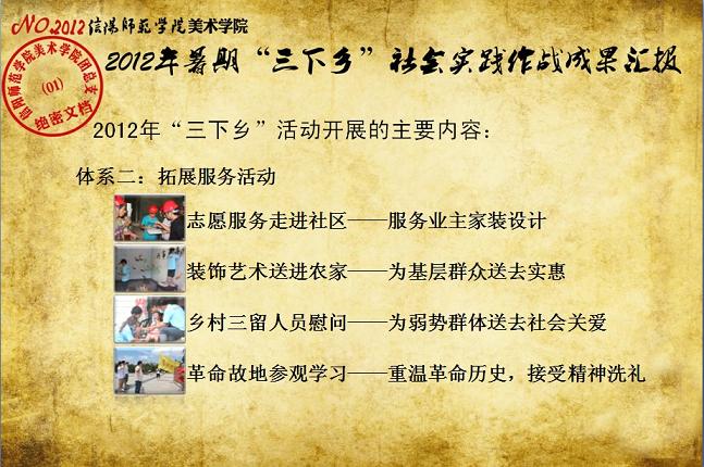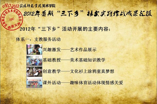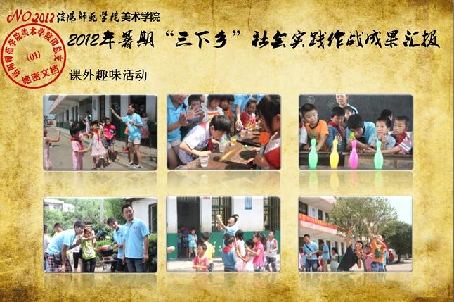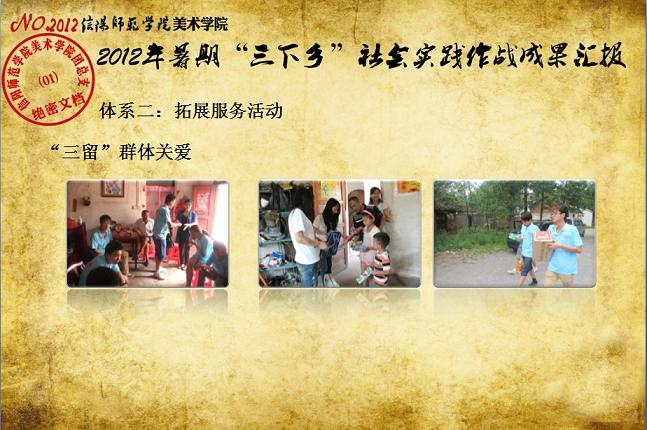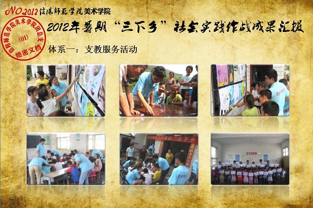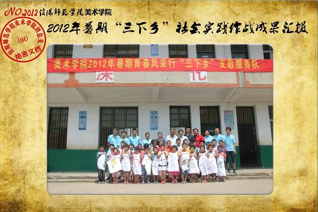 日前,公司《关于表彰信阳师范公司2012年老员工暑期“三下乡”社会实践活动先进集体和先进个人的决定》下达,公司2012年老员工暑期“三下乡”社会实践志愿服务队再次获评校“老员工暑期‘三下乡’社会实践活动先进集体”荣誉称号,志愿队一支队队长刘毅(2010级环境艺术设计班)同学获评“2012年河南省大中专员工暑期‘三下乡’和‘四进社区’实践教育活动先进个人”荣誉称号,齐东伟、周贤亮老师获评校“2012年老员工暑期‘三下乡’社会实践活动先进工作者”荣誉称号,陆杨等17名同学获评校“2012年老员工暑期‘三下乡’社会实践活动先进个人”荣誉称号。老员工暑期“三下乡”社会实践活动是高校实践育人的一个重要环节,是当代青年老员工深入基层、实践基层、服务基层,全面地了解社会、锻炼自我、促进自身成长与发展的一个有效平台。多年来,美术公司结合自身专业特色,将思想政治教育、专业技能实践、责任意识培养全面融入老员工暑期“三下乡”社会实践活动,形成了一系列广受社会欢迎和公司认可的特色品牌活动,2005年至今,美术公司已6次获评校老员工暑期“三下乡”社会实践活动先进集体。2012年暑期,美术公司团总支紧紧围绕“高举团旗跟党走、建功中原经济区”这一主题,结合“以支教服务为中心,充分发挥专业特色及队员特长,在扎实开展支教服务活动的同时,拓展性地开展各类有利于留守儿童情感关爱、有利于乡村基层文化建设、有利于青年员工思想成长的‘三下乡’志愿服务活动”的工作主线,组织志愿队员30余人,分两个支队分赴信阳市浉河区南湾村、信阳市建业森林半岛社区、信阳市光山县陈岗村小学、信阳市光山县刘邓大军王大湾会议旧址、信阳市新县鄂豫皖苏区革命纪念馆、信阳市新县浒湾乡等地开展了革命故地参观学习、艺术支教服务、志愿服务走进社区、装饰艺术送农家、“三留”人员情感关爱等一系列服务内容丰富、专业特色突出、教育主旨鲜明、服务成效显著的社会实践活动,受到了服务地干群的一致欢迎和认可。活动同时更得到了广大社会媒体的关注和支持,中新网、中原网、青年导报等多家新闻媒体对公司志愿队开展的一系列志愿服务活动进行了全面的宣传报道。