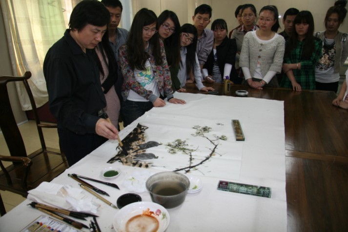 报告中,曹桂生教授从“中国画艺术概说”、“中国画的审美取向”、“中国画的意象特征”等三个方面作了系统讲解。曹桂生教授声情并茂的演讲、丰富翔实的图文资料,不时赢得在场听众的阵阵掌声。随后,他就国画创作技巧、方法等问题和现场师生进行了交流。最后,曹教授在美术公司临摹室,向同学们讲述自己在创作中的一些体会,并现场挥毫,为同学们示范绘画技巧。