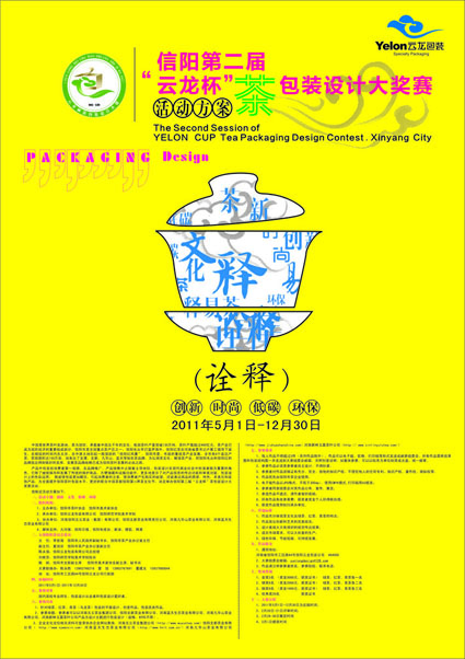 产品外包装给消费者第一观感,在品牌推广、产品销售中占据着主导地位。包装设计在现代商业社会中扮演者极为重要的角色,它除了继续保存和发展了传统的保护商品、方便储藏和运输功能外,更多地显示了对产品信息的传达功能和审美功能。包装设计上的色彩运用, 既能使包装更加醒目,引起消费者的注意,使消费者产生购买的欲望,还能表达商品的质感、特色,并美化和装饰产品。为全面提升信阳茶叶包装水平,更好的配合中国茶都信阳第20界茶文化节,决定举办信阳第二届“云龙杯”茶包装设计大奖赛活动。