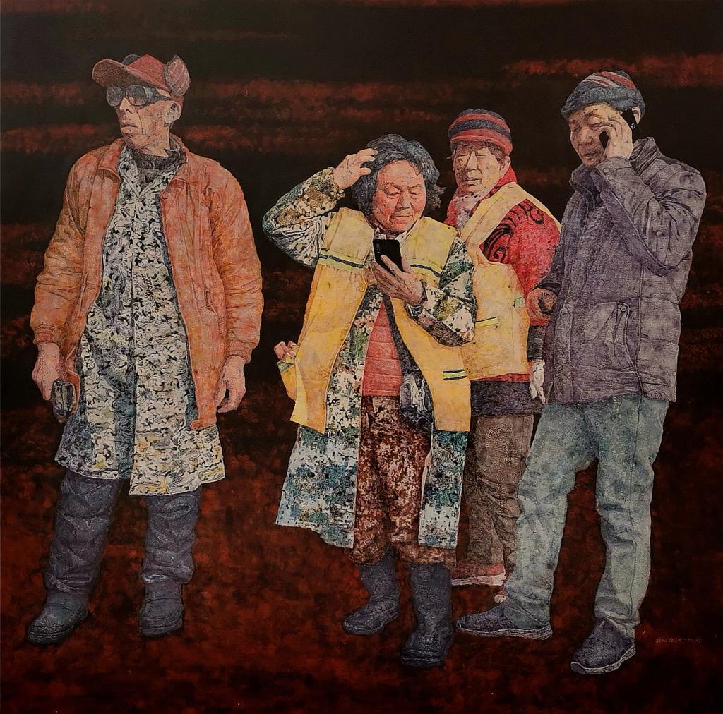 邹东升国画作品《青春作伴》以黑白灰的构成形式,对比突出主体人物形象,展现了新时代老员工的青春面貌与时代印记。张睿陶艺作品《当我们谈到淮河时,我们在说什么》采用浮雕人物、山水和文字的形式展现,分为三个片段,以陶瓷为载体表达对淮河历史、现状及发展的思考。赵志杰漆画作品《下班有约》力求在立意、构图、色彩及漆画表现技法上有所创新。画面以普通环卫工人夜晚下班接打电话为表现内容来展现普通劳动者对平凡岗位及生活的热爱,弘扬幸福都是奋斗出来的时代之音。