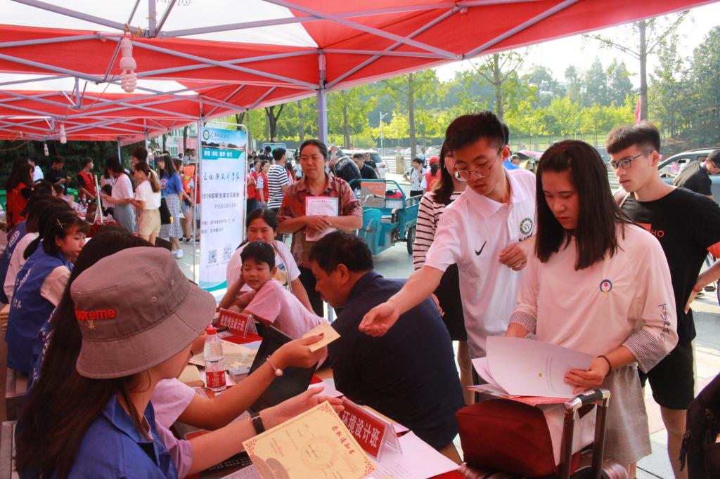公司辅导员郑波、饶海虹、胡霁芳,2019级新生班主任张暄、明政及迎新志愿者们轮流值班,时刻守候在迎新现场向新生及家长讲解报到流程并协助新生完成入学手续的办理。志愿者们统一服装、佩戴工作证为新生们拎包带路,大家以优质的服务去迎接新生,耐心地与家长沟通,为新生答疑解惑。他们的热情服务和灿烂微笑,赢得的新生及家长的一致赞扬,温馨和谐的氛围流淌在校园每一个角落,形成了一道亮丽的风景线。