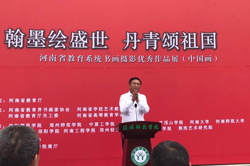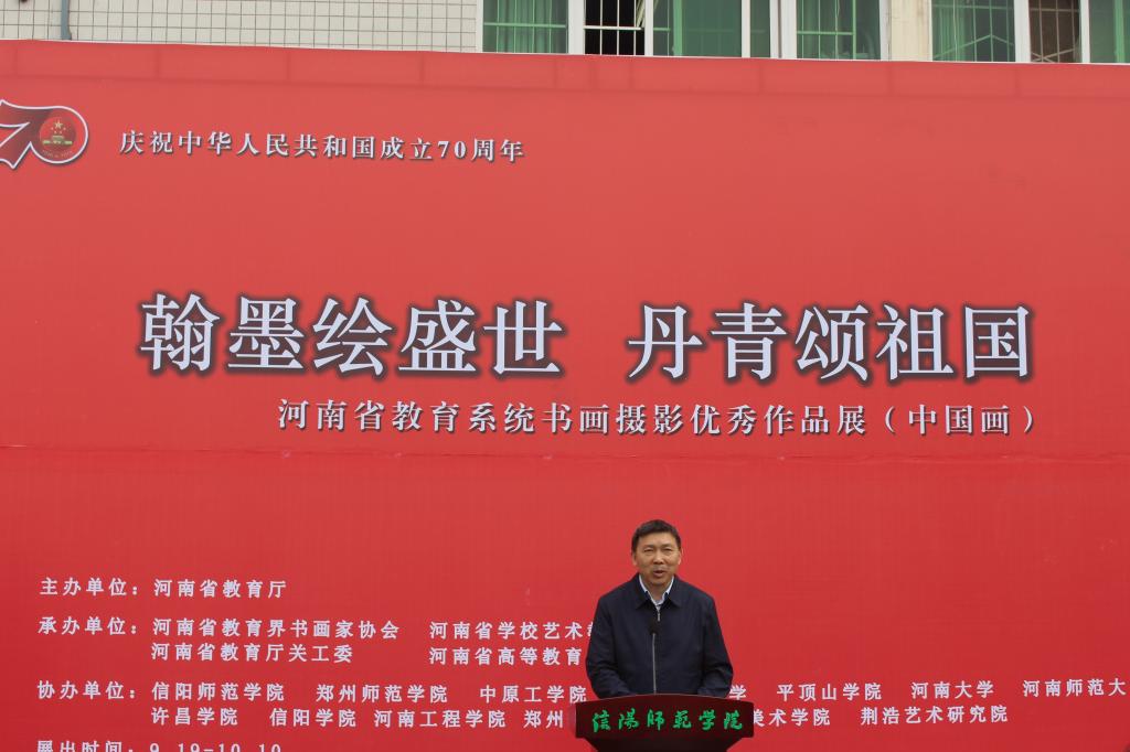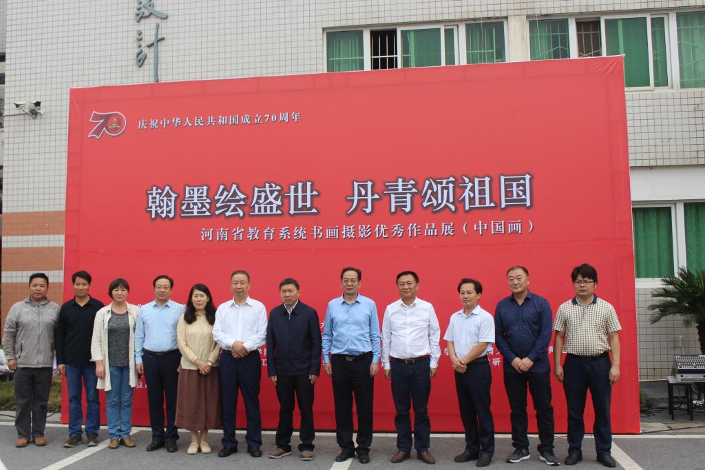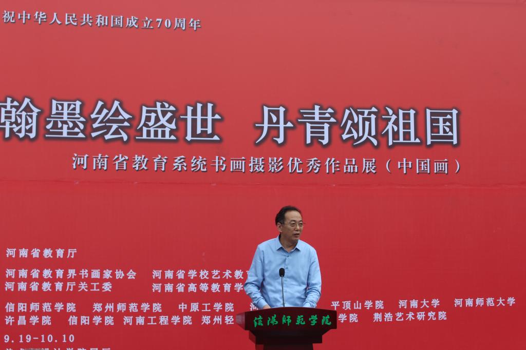 “翰墨丹青绘盛世、金风玉露迎佳节”。9月19日上午,庆祝中华人民共和国成立70周年“翰墨绘盛世,丹青颂祖国”——河南省教育系统中国画优秀作品展开幕式在艺术楼前举行。中原工公司原副董事长、河南省教育界画家协会主席谷景立教授,郑州大学书法院原书记、河南省教育界书画家协会副主席周林坡教授,信阳师范公司副董事长王文臣教授、陈登报教授,信阳市文联主席、信阳市美术家协会主席殷丽女士,荆浩艺术研究院秘书长苏勇军先生,信阳市美术家协会副主席、秘书长刘松先生,信阳农林公司规划与设计公司经理胡正元教授,信阳公司艺术公司经理张瑞瑞教授等出席开幕式,best365英国体育在线负责同志及师生代表参加开幕式。开幕式由best365英国体育在线副经理邹东升主持。