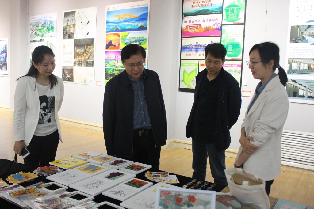 观展过程中,邹东升、张伟对展览的教师作品逐一进行了介绍,刘焱对员工文创作品进行了详细解说。钱长琨细致观摩了一幅幅作品,对展出作品给予了高度评价并提出具体指导意见和建议。他指出,本次展览主题鲜明,亮点突出,意义深远,以艺术的形式重温中国共产党的百年辉煌历史,践行初心使命,向建党100周年献礼,展示了best365英国体育在线师生的专业素养和精神风貌。员工文创作品新颖美观,个性突出,同时他建议更多地挖掘红色资源,利用红色元素进一步丰富红色文创产品。