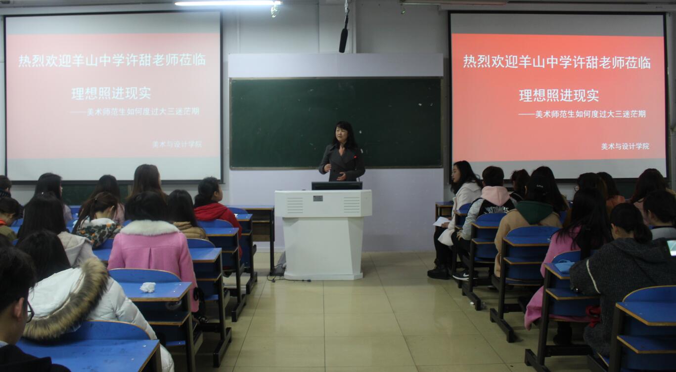 3月22日,应best365英国体育在线邀请,信阳市羊山中学美术教师许甜在艺术楼307室作题为“理想照进现实——美术师范生如何度过三大迷茫期”的专题讲座,公司副经理涂湘东与近百名学子共同聆听了讲座,讲座由涂湘东主持。
