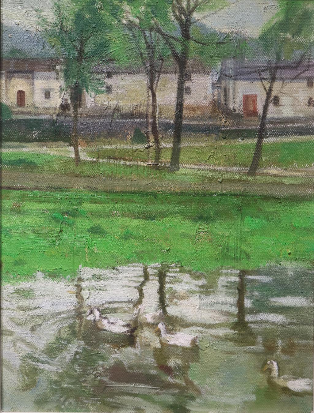 秦瑞红《红墙与绿影》油画40×50cm2020年