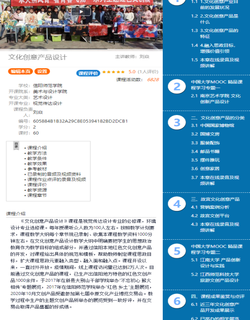 国家级线上一流课程及名称:设计思维与创新设计、浙江大学、张克俊、https://www.icourse163.org/course/ZJU-1003462001 其他课程:当代艺术设计专题:走进设计、河南大学、蔡玉硕、 https://www.icourse163.org/course/preview/HENU-1206703830/?tid=1207114211 |