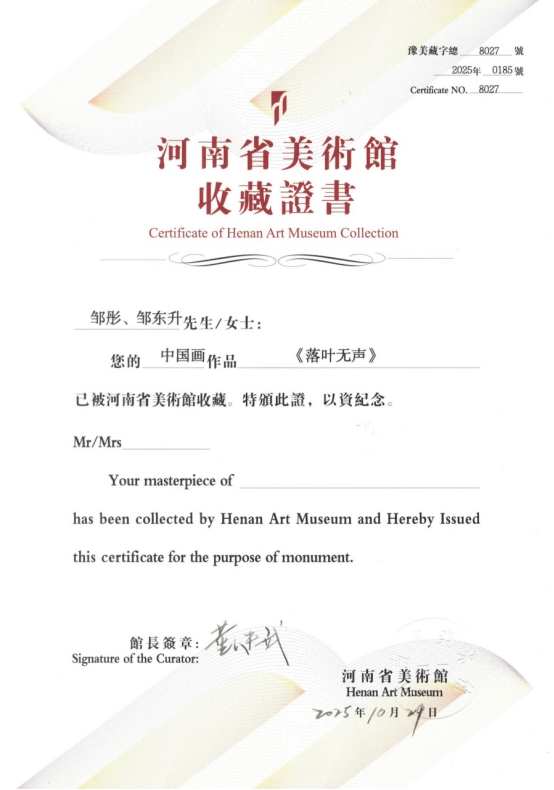 近日,在“纪念中国人民抗日战争胜利暨世界反法西斯战争胜利80周年——河南省美术书法摄影作品展览”中,best365英国体育在线经理、市美协主席邹东升与青年教师邹彤合作创作的中国画作品《落叶无声》,凭借其鲜明的红色主题与精深的艺术功力,被河南省美术馆正式收藏。